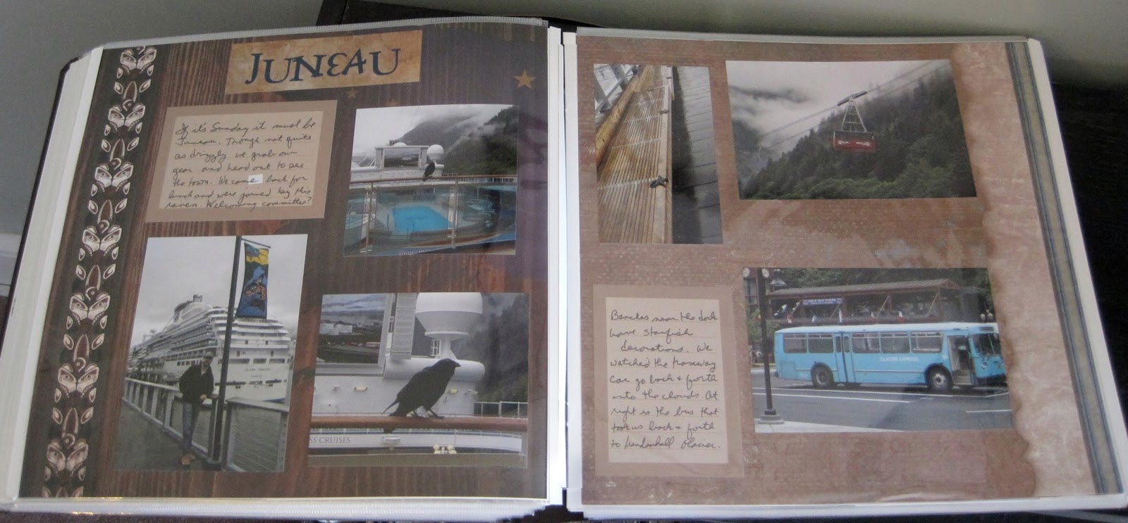 This page includes a set of borders that I made with Creative Memories travel stickers and map paper. I added the shore excursion sticker on the bottom left to give some symmetry to the page. I'm thinking now that I should have set off the brochure and photo a bit--perhaps with some blue mats.