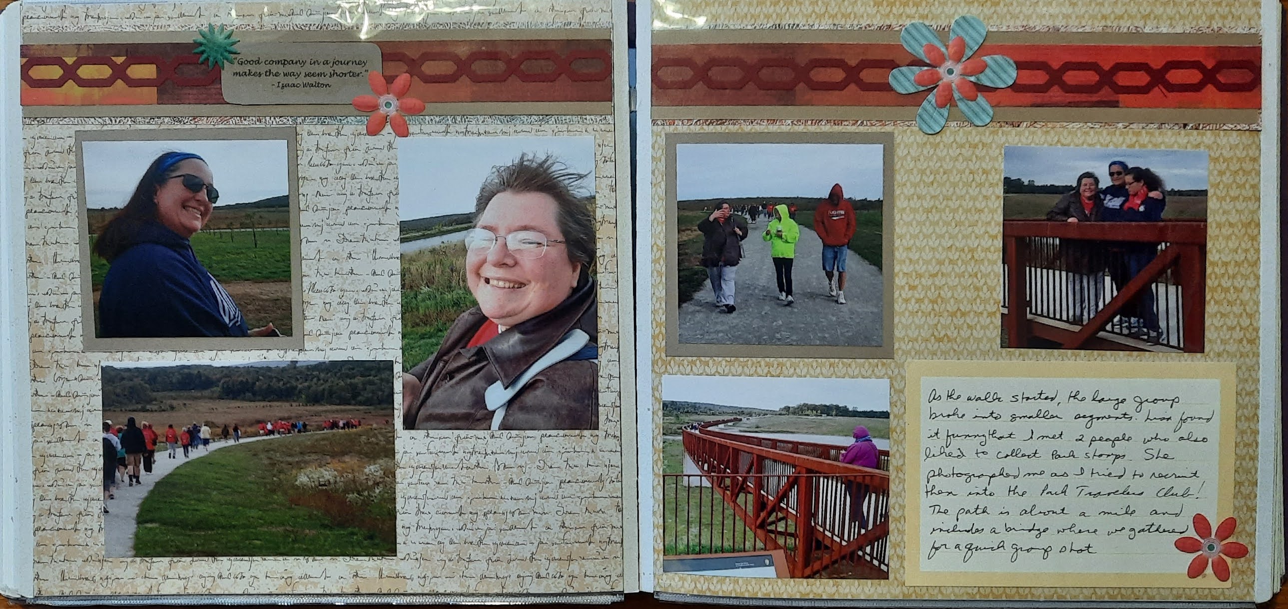 This layout focuses on the walk. Whenever I go to a National Park I always seem to find those like-minded passport devotees like myself and this walk was no exception. If you see the photo below where I'm talking to 2 people (lime and red hoodies), that was me touting the benefits of the National Park Travelers Club to potential members. Lisa found it amusing and took a photograph of it.