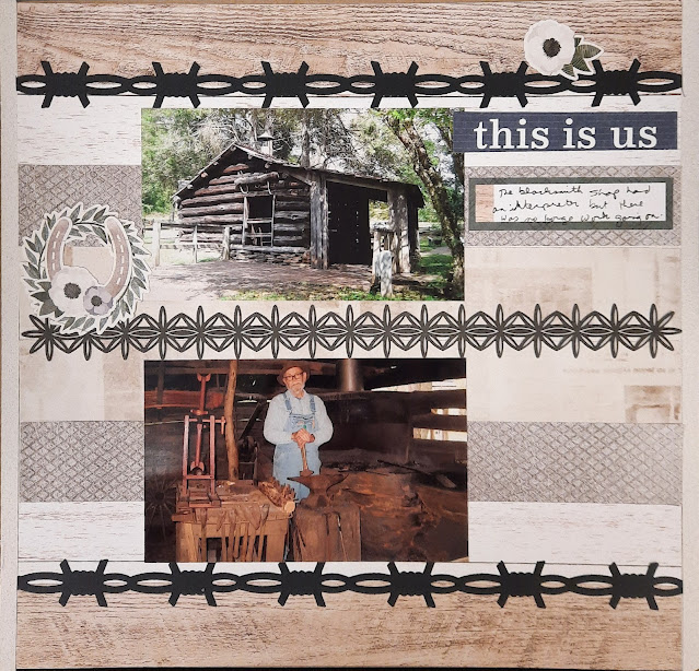 I once again turned to the Homestead pack for this layout. There are scraps of a few other heritage packs as well. The sketch I based this layout on is from the CM Virtual Crop posted for a Black Friday Challenge. It wasn't posted on the blog, just on the Facebook group. The sketch has a variety of 12" strips of paper to make the background and then some borders to highlight the photos. I chose a laser-cut border for the middle and then added 2 of the barbed-wire border maker cartridge strips in black cardstock. It gave a nice contrast to the lighter papers. The title came from a mat card in the pack. (It's also my favorite TV Show!)